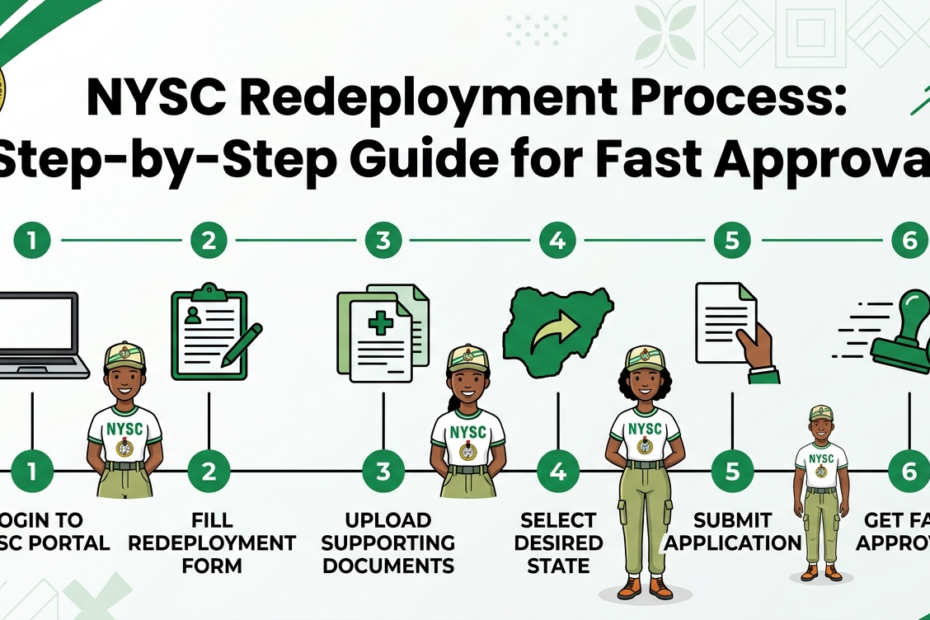 Redeploying through the NYSC portal is simple if you follow each step carefully. This guide uses a screenshot-style structure to help you understand what to click, where to upload documents, and how to complete your redeployment request successfully.